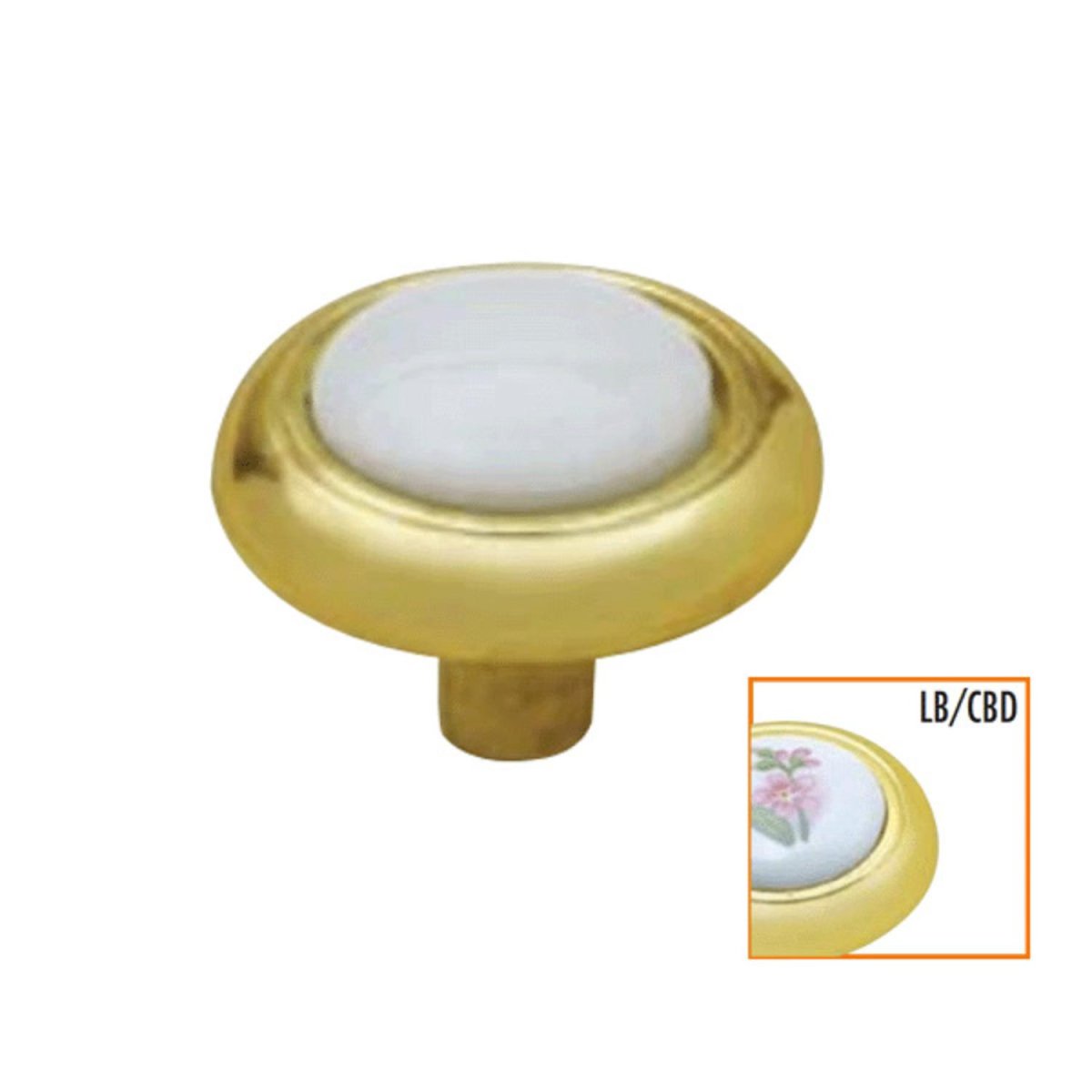 Jaladera linea tradicional botón de zamac acabado latón brillante combinada con ceramica decorada de 32mm de diámetro